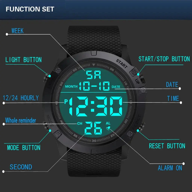 Designed for explorers, hikers, and outdoor adventurers, the Trail Teck™ Waterproof Digital Adventure Watch combines durability, functionality, and style to keep up with your most demanding adventures. Built to withstand shocks, water, and tough conditions, this watch is your perfect companion whether you're hiking through the mountains, camping in the wild, or simply tackling your daily routine.